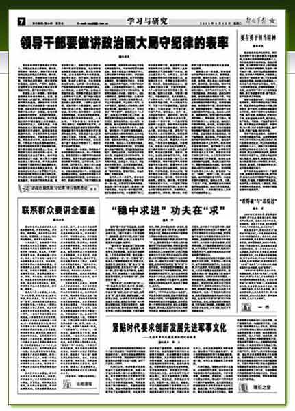 軍隊各級領(lǐng)導(dǎo)干部是部隊的帶兵人,無疑也應(yīng)當(dāng)成為講政治、顧大局、守紀(jì)律的“排頭兵”。領(lǐng)導(dǎo)干部只有自覺響應(yīng)胡主席提出的講政治、顧大局、守紀(jì)律的要求,積極參加學(xué)習(xí)教育活動,不斷強(qiáng)化政權(quán)意識、責(zé)任意識和憂患意識,高標(biāo)準(zhǔn)、嚴(yán)要求、做模范,才能帶領(lǐng)官兵把我軍真正建設(shè)成為軍魂意識牢固、履行使命堅強(qiáng)的軍隊。