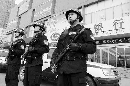 鄭州市公安局特警支隊(duì)長(zhǎng)李文正說(shuō),武裝特警按要求將于每小時(shí)不少于5~10分鐘在銀行門前跨立,并在附近巡區(qū)開(kāi)展巡邏。一名到銀行取錢的市民說(shuō),看到全副武裝的特警在這里守護(hù),心里很踏實(shí)。