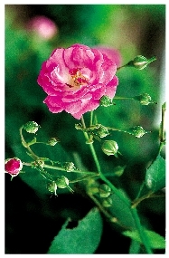 月季 小葉少,3~5片,但小葉較大,長(zhǎng)2.5~6.0厘米。葉面較平,不凹陷,無(wú)皺紋。枝直立 ,刺少, 新枝的枝端都有花。