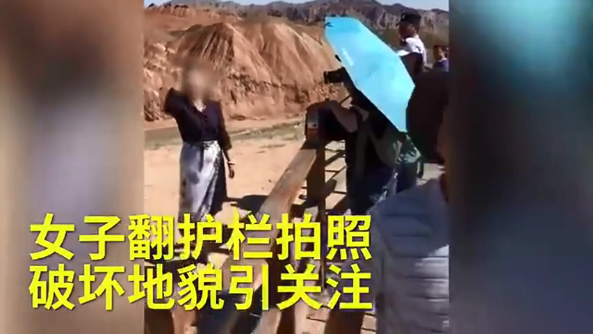 女游客翻欄桿踩丹霞地貌 只為拍照