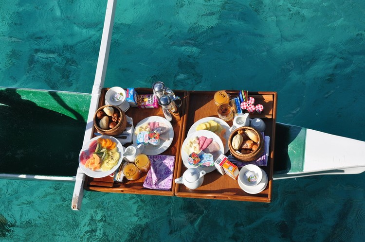 住在島上的水木屋里,睜開眼睛的時候,會有一對當(dāng)?shù)氐目∧忻琅瑒澲凰要毮局?,送上濃香的咖啡,配上吐司和各色水果。?dāng)然這頓早餐價格不菲哦!