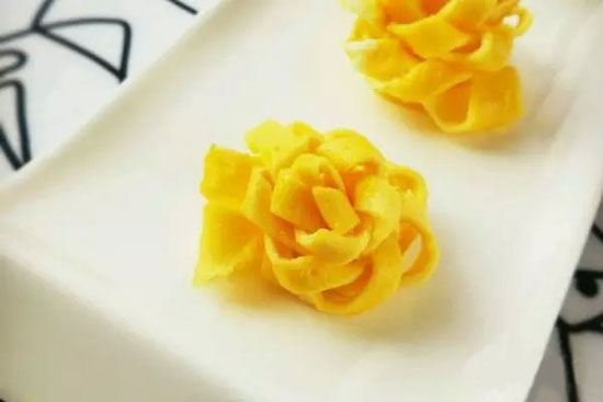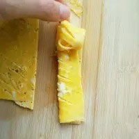 1. 雞蛋打散加少許鹽,淀粉加少許水調(diào)勻,加在蛋液中攪拌均勻,平底鍋小火,倒入蛋液,煎成薄薄的蛋皮,切成寬約4厘米的長(zhǎng)條。