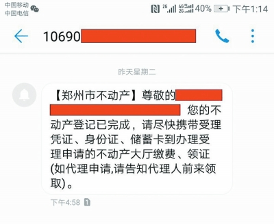 大河報記者了解到,鄭州市不動產(chǎn)登記中心目前正式推出了業(yè)務(wù)辦結(jié)的短信提醒服務(wù)。當(dāng)不動產(chǎn)登記部門在辦結(jié)申請人的相關(guān)申請后,便會給申請人(代理人)發(fā)去短信,提醒其及時前往不動產(chǎn)登記部門領(lǐng)取不動產(chǎn)登記證書、證明?!皬臉I(yè)務(wù)辦結(jié)到領(lǐng)證還有一些內(nèi)部流轉(zhuǎn)程序,一般情況下,我們都是在繕證完成后24小時發(fā)送短信?!毕嚓P(guān)負責(zé)人介紹說。