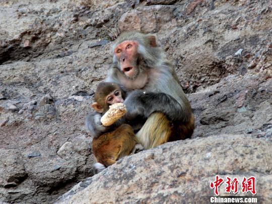 一只母猴帶著小猴在懸崖上吃玉米?!埛z