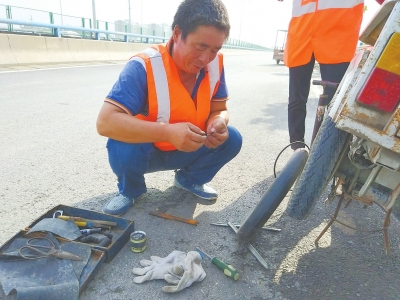 “扳子、螺絲刀、氣筒,這些工具家里都有,車胎爛了免費(fèi)補(bǔ)下,不值啥?!?月6日,在鄭州市中原西路南水北調(diào)大橋附近,環(huán)衛(wèi)工李紅軍忙完手頭的活,拿出隨身攜帶的工具,幫同事修補(bǔ)輪胎。不僅如此,他忙完路面清掃工作,過往民眾騎車爆胎或者損壞,只要是他力所能及,都可以免費(fèi)享受同事般的“禮遇”。